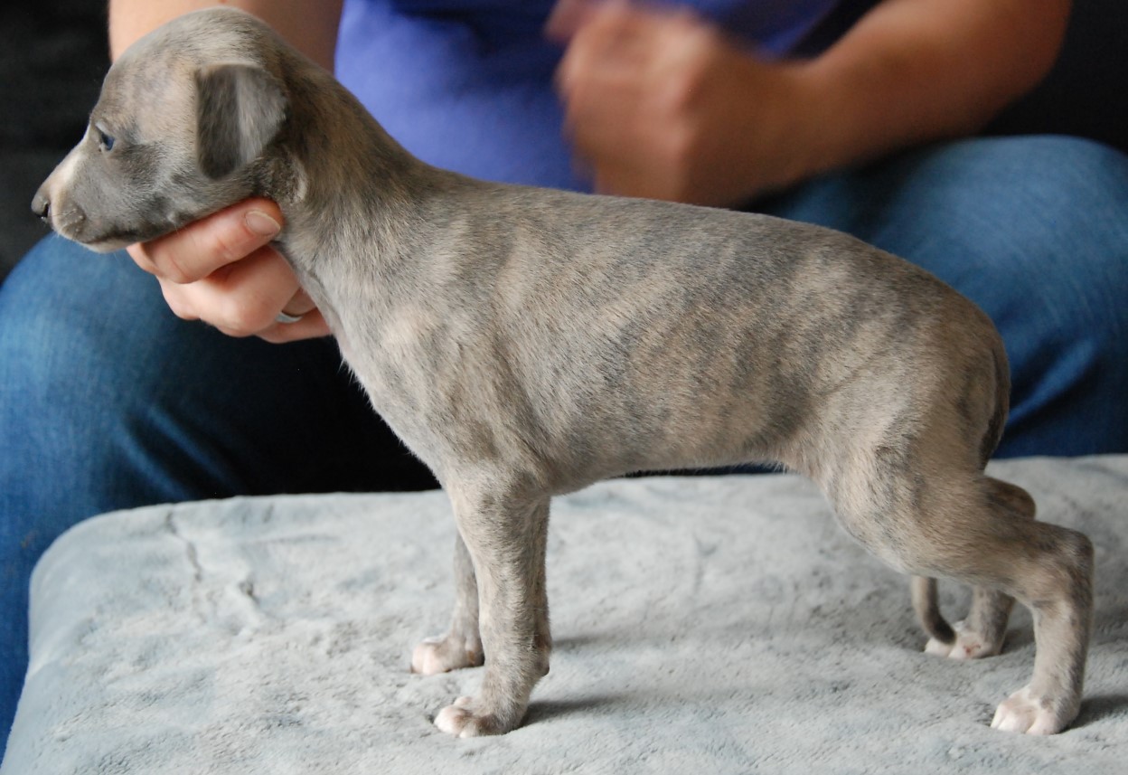 Hündin 3 blausand mit Stromung und weißen Abzeichen